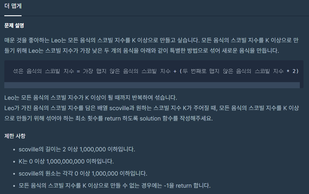 # 모든 음식의 스코빌 지수를 K 이상으로 만들 수 없는 경우, -1 리턴
