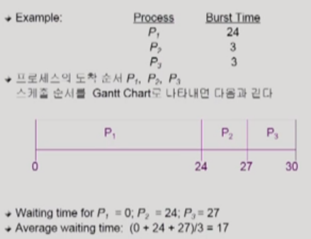 먼저 들어온 프로세스를 먼저 처리한다. 먼저 들어온 프로세스가 CPU bound job일 경우 처리 시간이 길어지므로, 효율적인 스케줄링은 아니다.