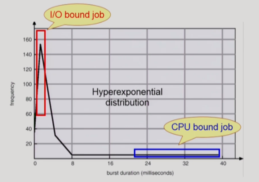 <CPU Burst 시간과 빈도에 따른 프로그램 분포> 위 그래프는 CPU Burst 시간과 그 빈도에 따라 프로그램들을 분류한 것인데, CPU Burst 시간이 짧을수록 프로그램의 CPU Burst 빈도가 잦음을 알 수 있다. 이 같이 CPU를 잡고 계산하는 것보다 I/O에 더 많은 시간을 사용하는 프로그램들을 I/O bound job이라고 하며, 반대로 계산 위주로 구성된 프로세스는 CPU bound job이라고 부른다.