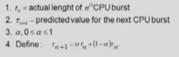 ※ CPU burst time 추정은 과거의 CPU 사용 흔적을 바탕으로 exponetial averaging 기법을 사용해 이뤄진다. 이 기법은 과거의 흔적일수록 덜 반영하고 최근 흔적일수록 많이 반영하는 흐름을 가진다.