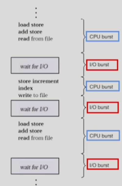 <CPU Burst & I/O Burst> 어떤 프로그램이 실행된다는 것은 CPU Burst와 I/O Burst가 번갈아 가며 일어나는 것을 의미한다. 프로그램의 종류에 따라 두 Burst의 빈번함이 다를 수 있는데, ① 사용자 관여가 많은 (키보드 입력, 모니터 출력 등이 잦은) 프로그램(interactive job)은 CPU Burst 시간이 짧아지면서 두 Burst가 번갈아 빈번히 나타나고, ② 과학 계산용 프로그램 같은 연산 시간이 긴 프로그램은 CPU Burst 시간이 길어지면서 I/O 비중이 크게 줄어든다.
