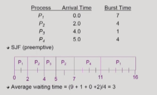 현재 수행 중인 프로세스의 남은 burst time보다 더 짧은 CPU burst time을 가지는 새로운 프로세스가 도착하면 CPU를 빼앗는다. 주어진 프로세스들에 대하여 minimum average waiting time을 보장한다. (어떤 알고리즘도 이 waiting time 보다 빠를 수 없다.)