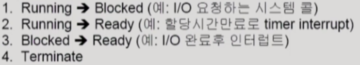 - 1, 4의 스케줄링은 nonpreemptive(=자진 반납, 비선점형), 나머지 모든 스케줄링은 preemptive(=강제로 뺏음, 선점형, 대부분의 현대적인 CPU 스케줄링에서 사용)