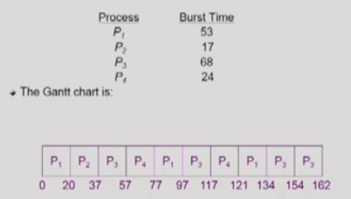 - n개의 프로세스가 ready queue에 있고 할당 시간이 q time unit인 경우 각 프로세스는 최대 q time unit 단위로 CPU 시간의 1/n을 얻는다. (어떤 프로세스도 (n-1)q time unit 이상 기다리지 않는다.)