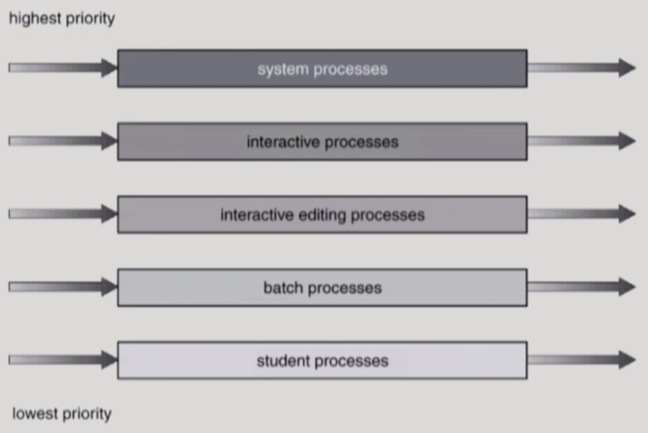 <우선도가 다른 ready queue> Ready queue를 foreground(interactive)와 background(batch - no human interaction)으로 분리한다. 그리고 foreground에는 RR, background에는 FCFS 등으로 각 큐에 독립적인 스케줄링 알고리즘을 설계한다. 또한 어떤 큐에게 CPU를 줄 지 (그 이후에는 큐에 있는 어떤 프로세스에게 CPU를 줄 지)결정하는 작업이 필요한데, 이를 큐에 대한 스케줄링으로 해결한다. Fixed priority scheduling은 우선도를 최우선으로 하여 우선도가 높은 foreground에게 먼저 scheduling하고 그 다음 background에게 주는 방식이다. 이 방식에서는 starvation이 단점이 될 수 있다. 이에 대한 대안으로 Time Slice가 있는데, 이 스케줄링은 각 큐에 CPU time을 적절한 비율로 할당한다. (ex. foreground에 80% background에 20% CPU time 분배)