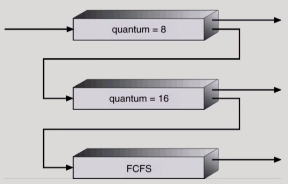 <Multi-level feedback queue> 우선도가 높은 queue여도 상황에 따라 낮은 우선도 queue가 높은 우선도 queue보다 우선될 수 있다. Multi-level queue의 고정된 우선도라는 단점을 극복하기 위한 대안이다. 예를 들어, 들어오는 프로세스를 우선도가 가장 높은 queue에 줄 세우고 RR 방식을 사용하되, 우선도가 낮은 queue일수록 time quantum을 길게 준다. 그래서 time quantum 내에 프로세스가 완료되면 큐에서 내보내고, 완료되지 않았으면 다음으로 우선도가 높은 큐에 해당 프로세스를 줄 세운다. 이렇게 하면 CPU burst가 짧은 프로세스에 우선 순위를 더 많이 주고, CPU burst가 긴 프로세스의 우선도는 더 낮출 수 있다.