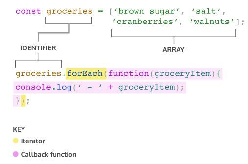 forEach()는 특정 함수를 array 각각의 element들에 적용하는 iterator입니다. 보통 iterator의 인자로 함수를 받은 후, element들 각각을 인자로 사용해 해당 함수를 호출합니다. (이렇게 다른 함수의 인자로 사용되는 함수를 callback 함수라고 부릅니다.)forEach()는 기존의 array를 변경하지 않으며,undefined를 return합니다.groceries.forEach(groceryItem => console.log(groceryItem));또한, arrow function을 인자로 사용해 iterator를 호출할 수도 있습니다. 이처럼, iterator의 인자로 사용되는 함수의 syntax는 임의로 자유롭게 사용할 수 있습니다.