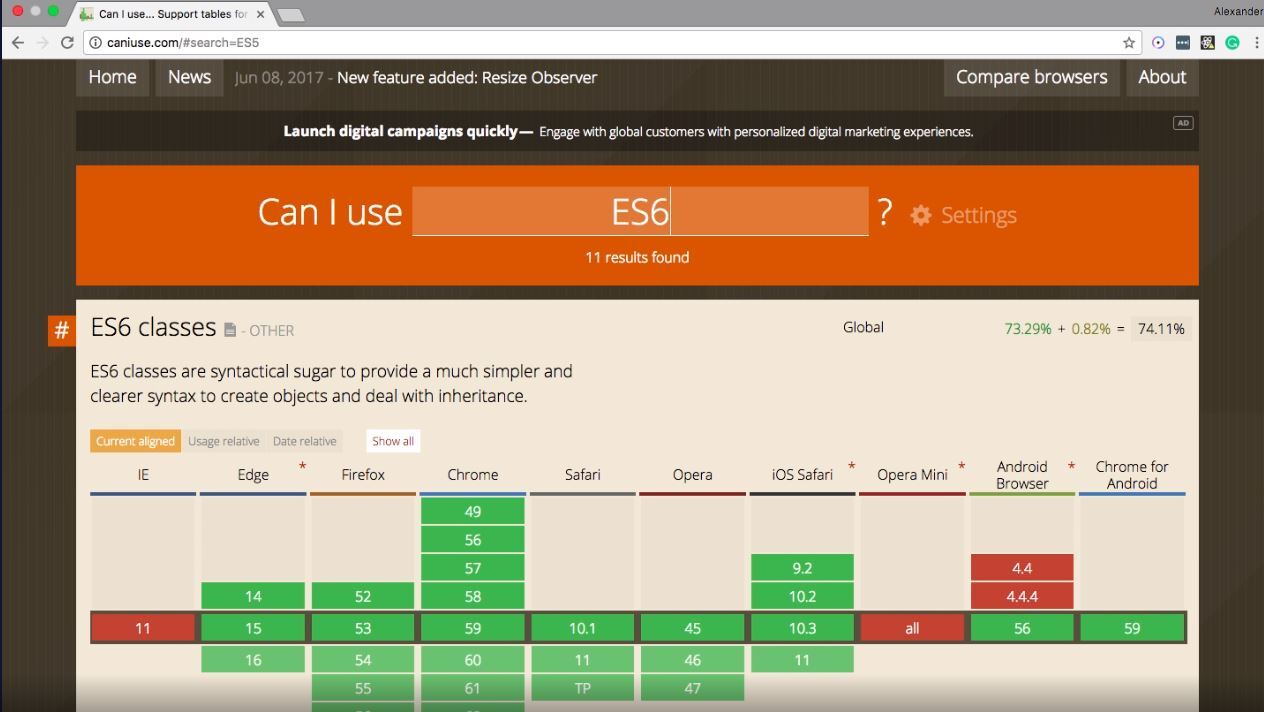 이 곳에서 검색해보면, ES5는 여전히 대다수의 브라우저에서 지원됩니다. 이와 달리, ES6는 점진적인 적용을 감안해야 합니다. 그 결과 대부분의 최신 버전 브라우저에서는 ES6가 원활히 지원되는 반면, ES6 module과 같은 ES6의 특정 feature들은 지원되지 않는 브라우저가 아직 대다수입니다.