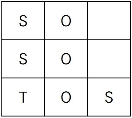 다음과 같이 3x3 크기의 복도의 정보가 주어진 상황을 확인해보자. 본 문제에서 위치 값을 나타낼 때는 (행,열)의 형태로 표현한다. 선생님이 존재하는 칸은 T, 학생이 존재하는 칸은 S, 장애물이 존재하는 칸은 O로 표시하였다. 아래 그림과 같이 (3,1)의 위치에는 선생님이 존재하며 (1,1), (2,1), (3,3)의 위치에는 학생이 존재한다. 그리고 (1,2), (2,2), (3,2)의 위치에는 장애물이 존재한다.