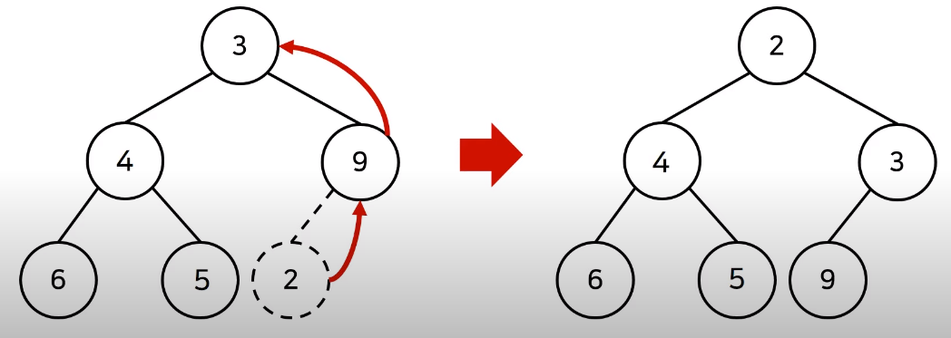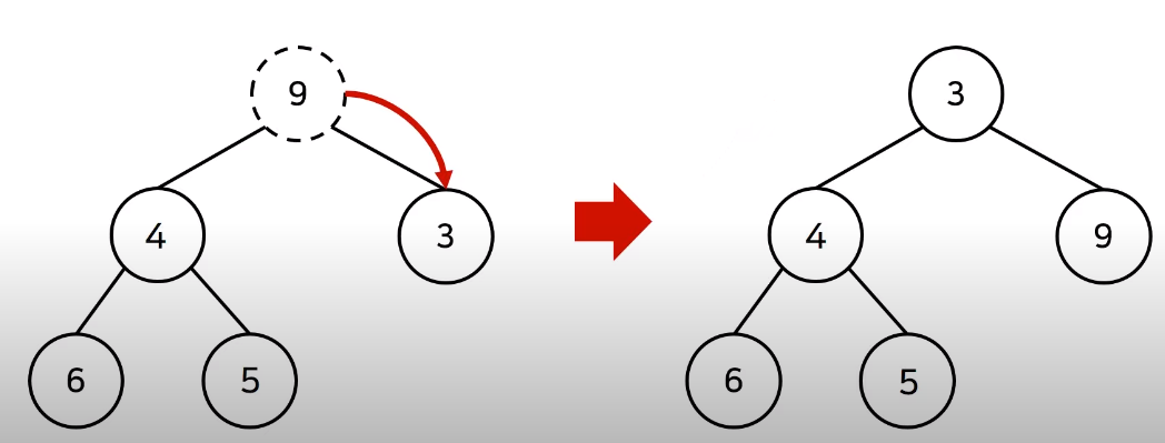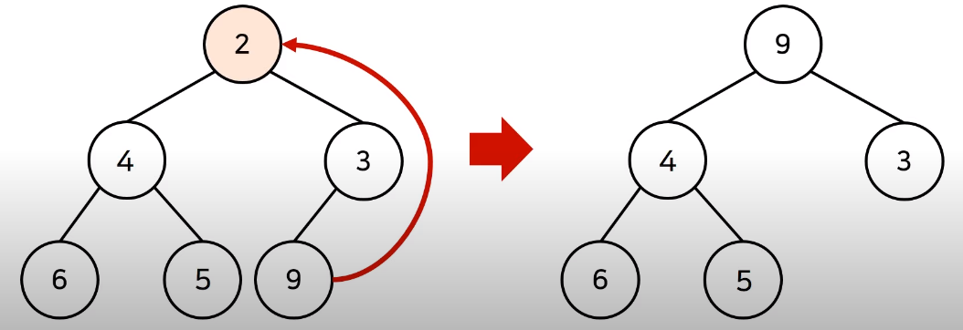 원소를 제거할 때는 루트 노드 위치에 가장 마지막 노드가 오게 하고, 루트 노드에서 하향식으로 더 작은 자식 노드를 찾아 위치를 바꾸며 Heapify()를 사용한다. 이러한 방식은 마찬가지로 O(logN)의 시간 복잡도를 지닌다.
