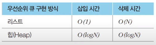 우선순위 큐는 우선순위가 가장 높은 데이터를 가장 먼저 삭제하는 자료구조이다. 데이터를 우선순위에 따라 처리하고 싶을 때 사용한다. 우선순위 큐는 리스트(List), 힙(Heap) 두가지 방식으로 구현 가능하다.