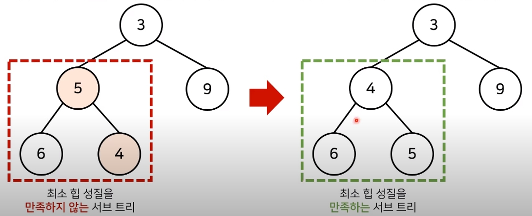 최소 힙을 예시로 구현 방식을 살펴보자. 힙 자료구조가 힙의 성질을 갖게하기 위해 힙 구성함수 Heapify()를 사용할 수 있다. 최소 힙에 사용되는 최소 힙 구성함수 Min-Heapify()는 부모 노드로 거슬러 올라가며, 부모보다 자신의 값이 더 작은 경우에 위치를 교체한다.(상향식)