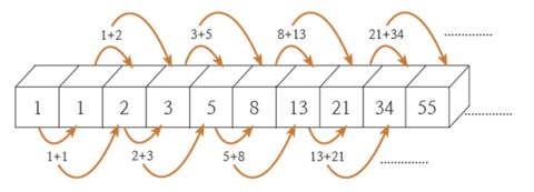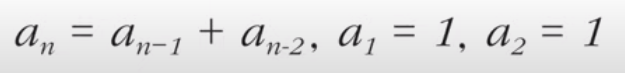 피보나치 수열은 위와 같이 점화식 형태로 만들어 간결하게 표현할 수 있다. 점화식이란 인접한 항들 사이의 관계식을 말한다. 따라서, 위 식은 n번째 피보나치 수는 (n - 1)번째 피보나치 수와 (n - 2)번째 피보나치 수를 합한 것이고 단, 1번째 피보나치 수와 2번째 피보나치 수는 1임을 의미한다.