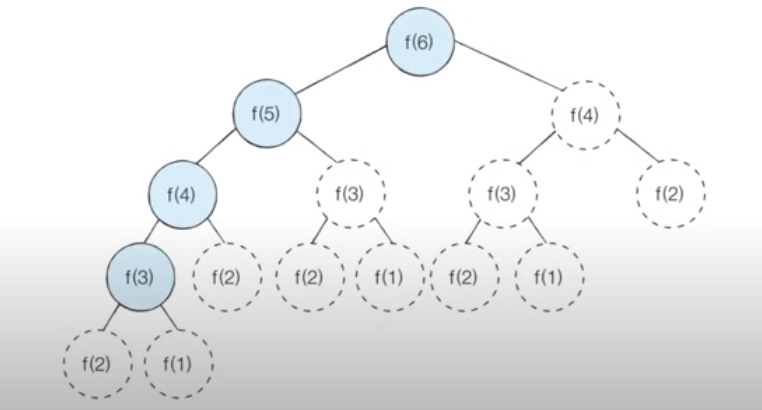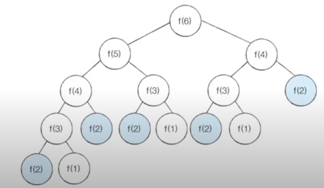 이는 중복되는 부분 문제로 살펴볼 수 있는데, f(6)을 호출하는 예시에서는 f(2)가 총 5번 중복으로 계산되는 것을 알 수 있다. 이렇게 중복되는 부분을 또 다시 계산하는 비효율성을 다이나믹 프로그래밍으로 극복할 수 있다.