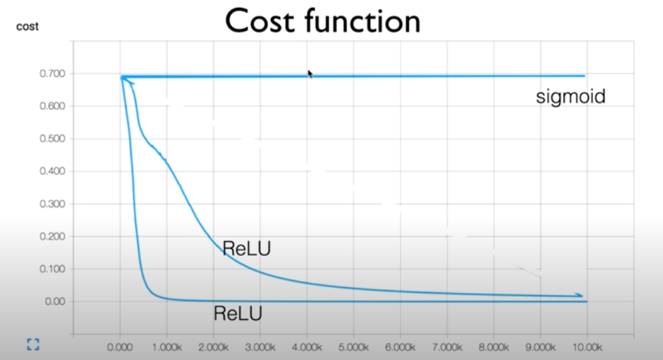 실제로 Neural Net에 ReLU 함수를 적용 시, 미동이 없는 시그모이드에 비해 ReLU가 빠르게 Cost 함수를 줄여나가는 것을 관찰할 수 있다.