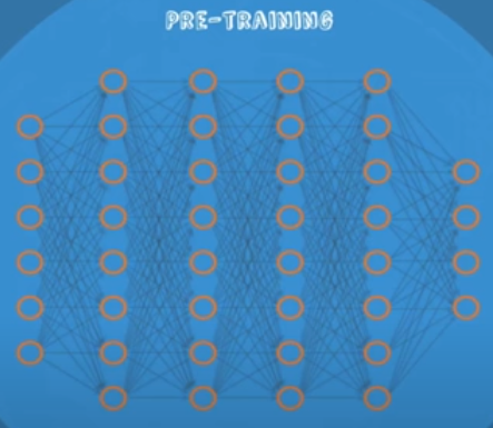 전체 네트워크에 대해 RBM을 사용해 가중치를 학습시키는 것을 Pre-Training이라고 한다. 이것을 구현하기 위해 먼저 인접한 첫 번째와 두 번째 레이어에 대해 encoder와 decoder로 값을 비교하여 가중치를 학습시키고 다음 인접한 두 번째, 세 번째 레이어에 대해서도 똑같은 과정을 반복하며 네트워크의 끝까지 모든 레이어에 대해 가중치를 학습시킨다.