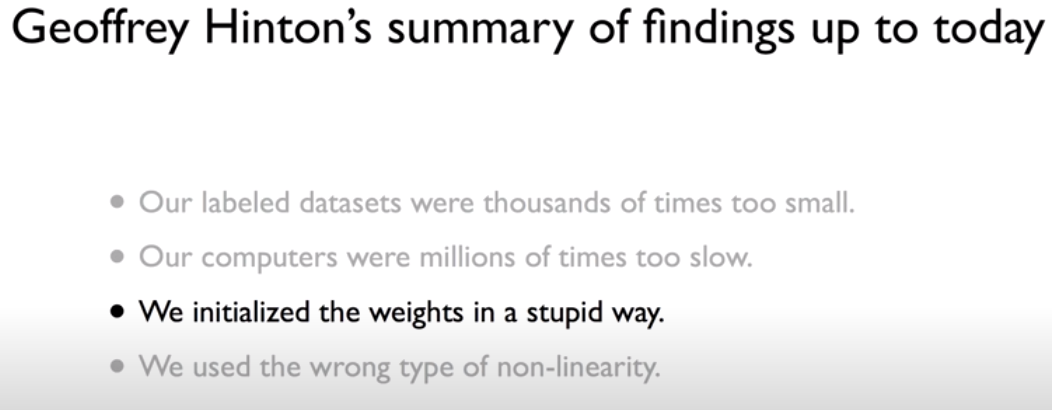 Geoffrey Hinton 교수가 찾아낸 Neural Network가 제대로 동작하지 않는 이유들 중 하나는 가중치 초기화의 문제이다.