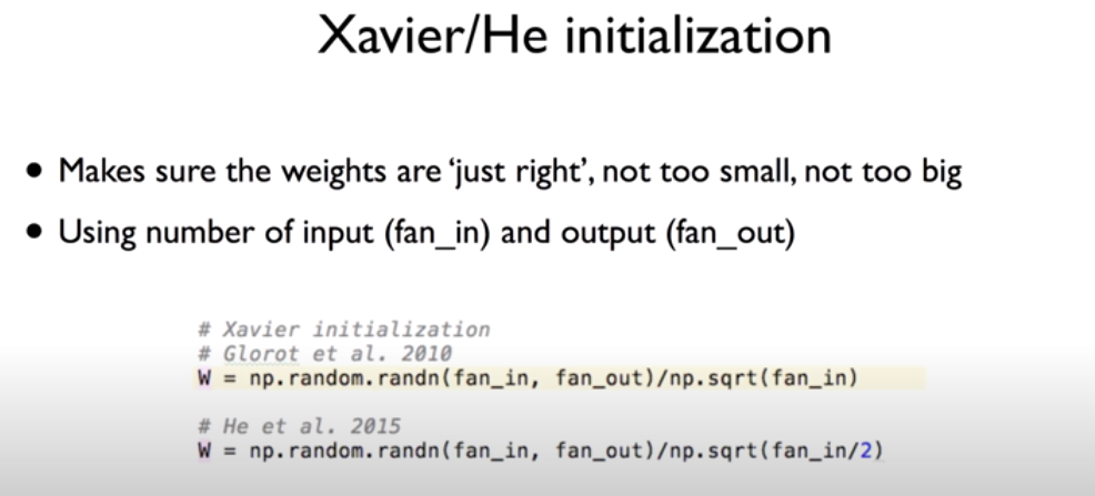 RBM을 사용해 가중치를 초기화하는 과정을 하나하나 거쳐가는 것은 복잡하다. 초기화 과정을 더욱 간단하게 진행하기 위해 Xavier initialization, He initialization 등의 초기화가 등장했다. 이 두 방법은 input 값의 개수와 output 값의 개수를 고려하여 초기화를 진행하는 방법인데, 위 식과 같이 초기화를 진행하면 RBM을 사용한 것과 동일한 혹은 더 나은 성능을 보여준다고 알려져 있다. 흥미로운 점은 He initialization이 Xavier initialization의 식에서 단순히 분모 루트 안의 값을 2로 나눠주는 것으로 Xavier initialization보다 더 좋은 성능을 보여준다는 사실이다.