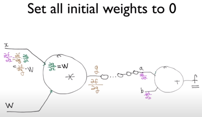 예를들어, 극단적으로 가중치를 0으로 초기화하면 backpropagation으로 구한 x에 대한 f(x)의 기울기 값이 0이 되어 기울기가 소실되는 현상이 발생한다. 이 경우 학습이 원활하게 이뤄지지 않기 때문에, 가중치 초기화의 첫번째 유의점은 'w를 모두 0으로 설정하지 말자.'이다.