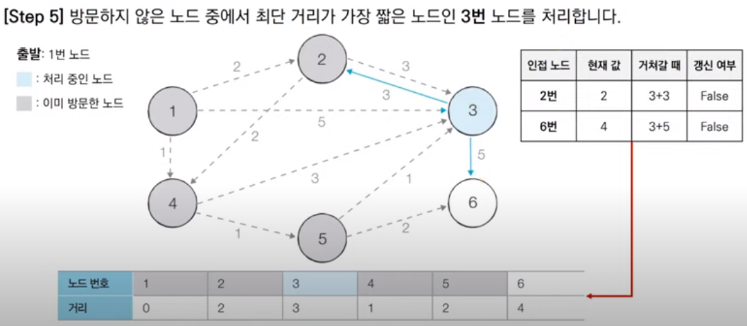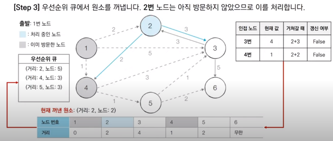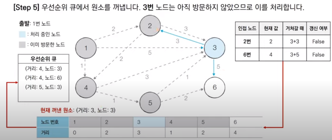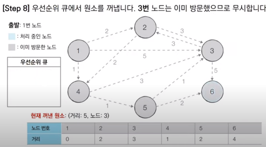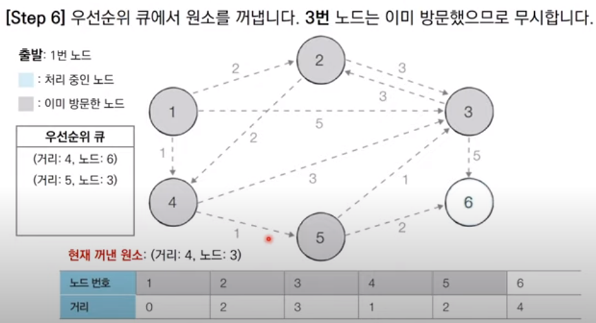 다음 우선순위 큐에서 꺼낸 노드는 3번 노드이다. 3번 노드는 이미 방문한 적이 있으므로 처리하지 않고 넘어간다. 이 때, 따로 방문 여부를 체크할 리스트 테이블을 만들지 않고, 단순히 큐에서 꺼낸 노드의 거리 값과 최단 거리 테이블의 거리 값을 대소 비교해 큐에서 꺼낸 노드의 거리가 크면 무시하고 넘어가는 방법을 사용할 수 있다.