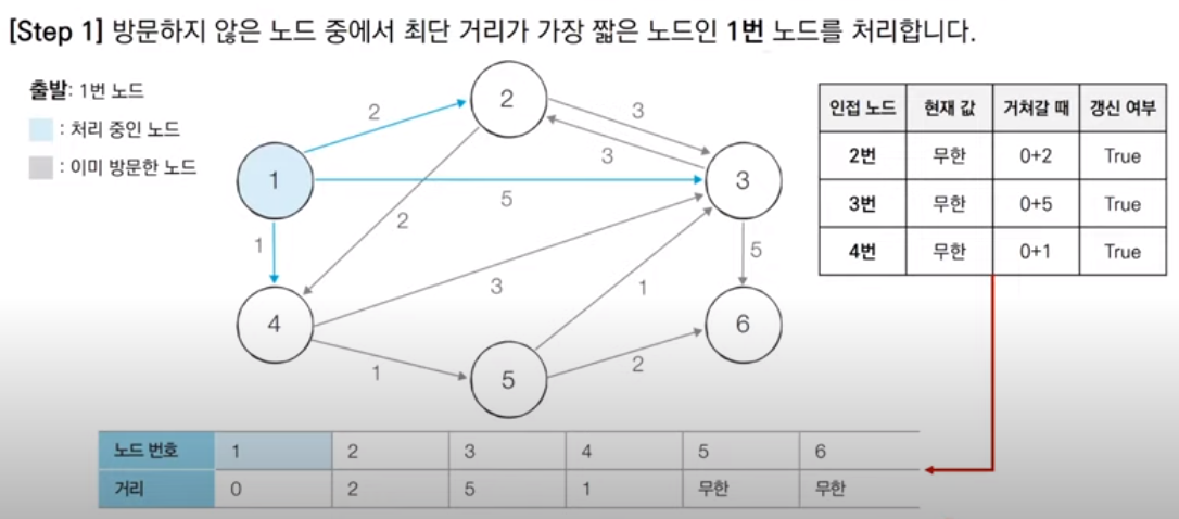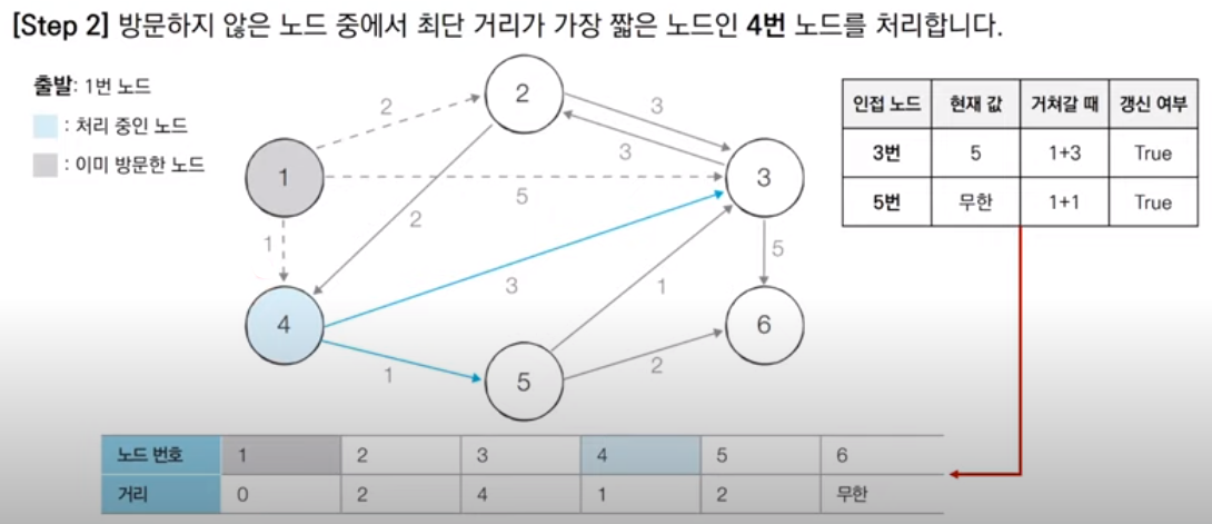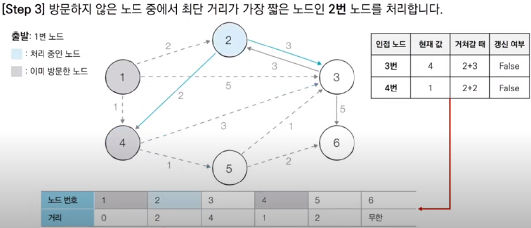 3. 방문하지 않은 노드 중에서 최단 거리가 가장 짧은 노드를 선택한다.