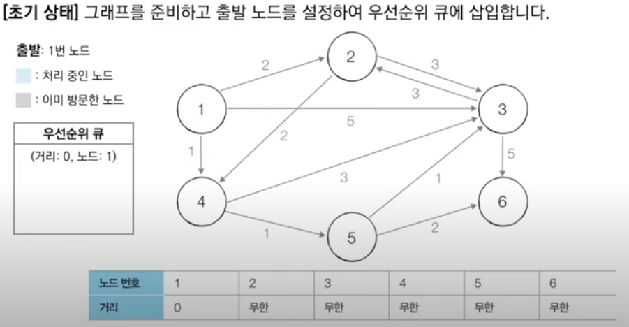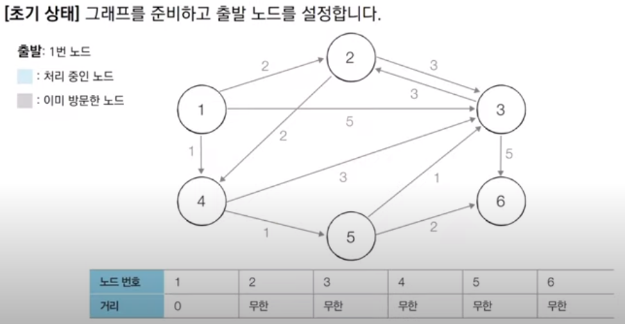 2. 최단 거리 테이블을 초기화한다. (자기자신으로 향하는 비용은 0, 다른 모든 노드로 향하는 비용은 무한(inf)로 설정)