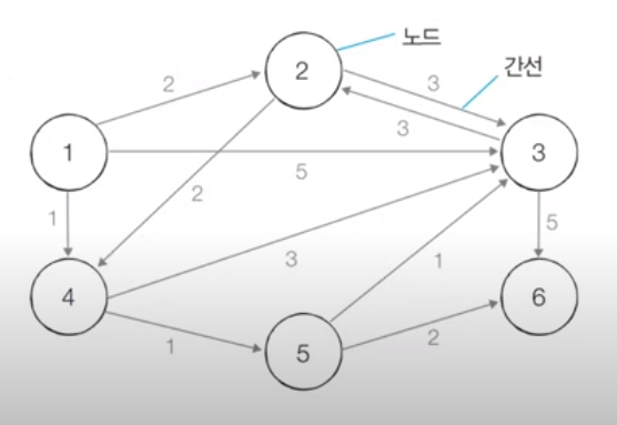 위 그림과 같이 간선에 방향성이 있는 그래프를 사용해 다익스트라 알고리즘의 더 구체적인 수행 과정을 살펴보자. 먼저, 출발 노드는 임의로 1번 노드로 설정하고 최단 거리 테이블을 초기화한다. 최단 거리 테이블에서 1번은 자기자신으로 향하므로 값을 0으로 설정하고 나머지 모든 노드는 무한 값을 설정해 진행한다.