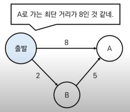 다익스트라 알고리즘에서 최단 거리 테이블은 각 노드에 대해서 현재까지의 최단 거리 정보를 가지고 있다. 그리고 알고리즘 수행 과정에서 이미 기록된 최단 거리 정보보다 더 짧은 경로를 찾게 되면, 찾은 경로의 거리를 최단 거리 테이블에 갱신한다. 위 그림을 살펴보면, 현재까지 A로 가는 최단 거리가 8로 기록되어 있지만, 다음 탐색에서 B를 경유해 A로 가는 경로가 더 짧음을 확인했다면 해당 경로의 거리인 7을 최단 거리 테이블에 갱신해준다.