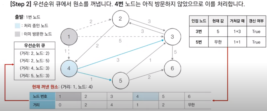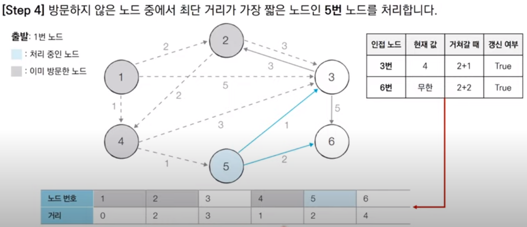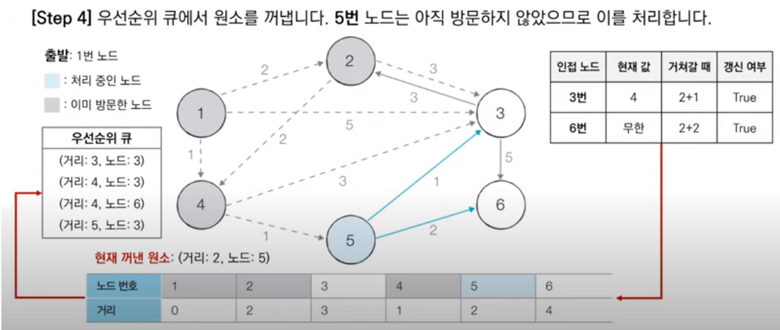 다음으로 우선순위 큐에서 다시 원소를 꺼내 방문 여부를 파악한다. 큐에서 꺼낸 4번 노드는 아직 방문하지 않은 노드이므로 방문처리한다. 그리고 인접한 3, 5번 노드의 최단 경로 값을 계산해 현재 값과 비교하고 테이블을 갱신한다. 3번 노드는 최단 경로 값이 1+3으로 현재 값 5보다 작고 5번 노드도 1+1로 현재 값 무한대보다 작으므로 두 노드 다 값을 갱신한다. 그 후 갱신한 두 노드를 우선순위 큐에 넣는다. 이 때, 우선순위 큐 속 노드들은 거리를 기준으로 오름차순 정렬되어 알고리즘 수행에 적합하게 재정렬됨을 확인할 수 있다.