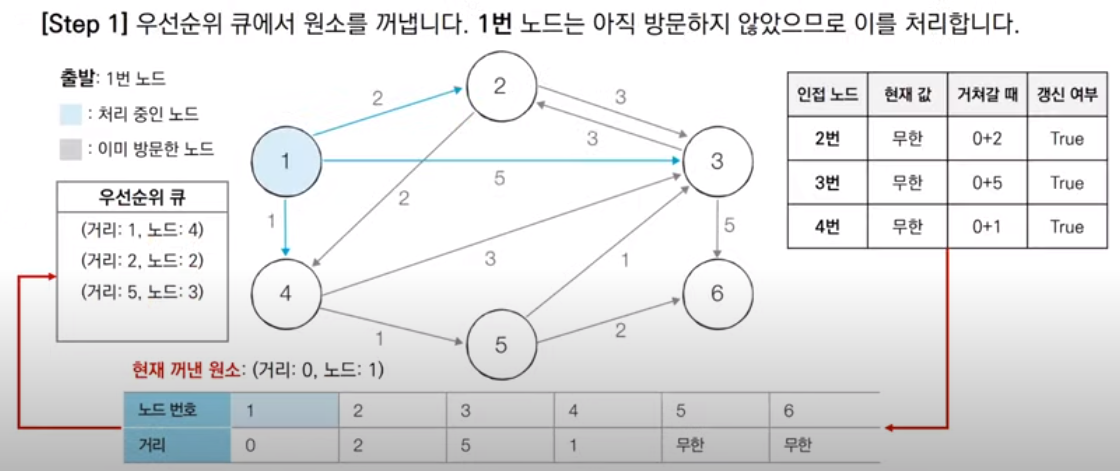이후 매 단계마다 우선순위 큐에 담긴 원소를 꺼내서 해당 노드에 대한 방문 여부를 확인하고 처리하는 과정을 반복한다. 이번 단계에서 큐로부터 꺼낸 원소는 아직 방문하지 않은 1번 노드이므로, 1번 노드를 방문 처리하고 인접한 노드에 대한 최단 거리 값을 갱신한다. 1번 노드와 인접한 노드는 2, 3, 4번 노드가 존재하고 각각 0+2, 0+5, 0+1의 최단 경로 값을 가지므로, 현재 테이블의 무한 값을 갱신하고 갱신한 노드를 우선순위 큐에 삽입한다. 여기서 큐에 삽입하는 노드는 최단 거리 값이 갱신된 노드만 해당된다는 점을 유의하자.