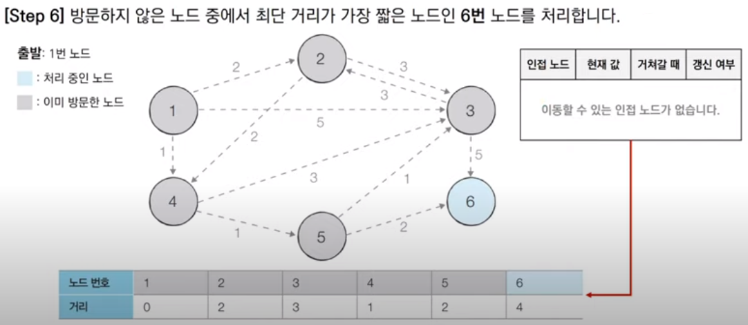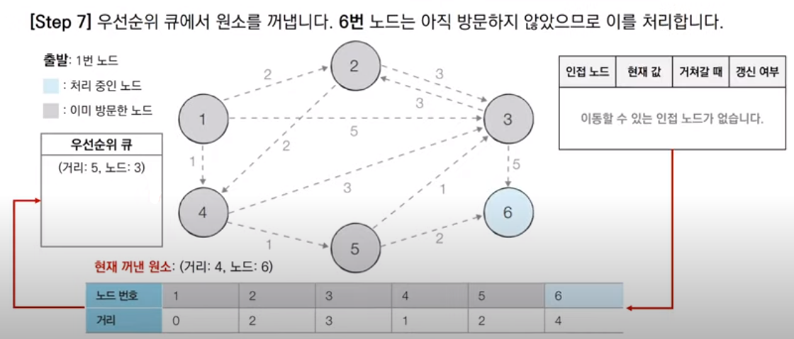 같은 방식으로 우선순위 큐에서 원소를 꺼내 확인한다. 나온 원소는 6번 노드이고 아직 방문하지 않았으므로 방문처리한다. 6번 노드는 인접한 노드가 없기 때문에 따로 갱신처리하지 않는다.