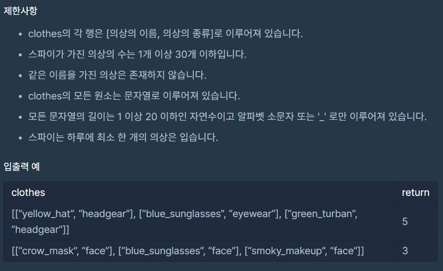 Dictionary 자료형의 Value 값을 List 재구성하는 방법을 도저히 모르겠었는데 다른 분의 답안을 보며 터득할 수 있었다. 경우의 수도 조합을 사용하며 너무 복잡하게 생각했는데, 조금의 아이디어로 간단히 계산한 방법을 기억하자.